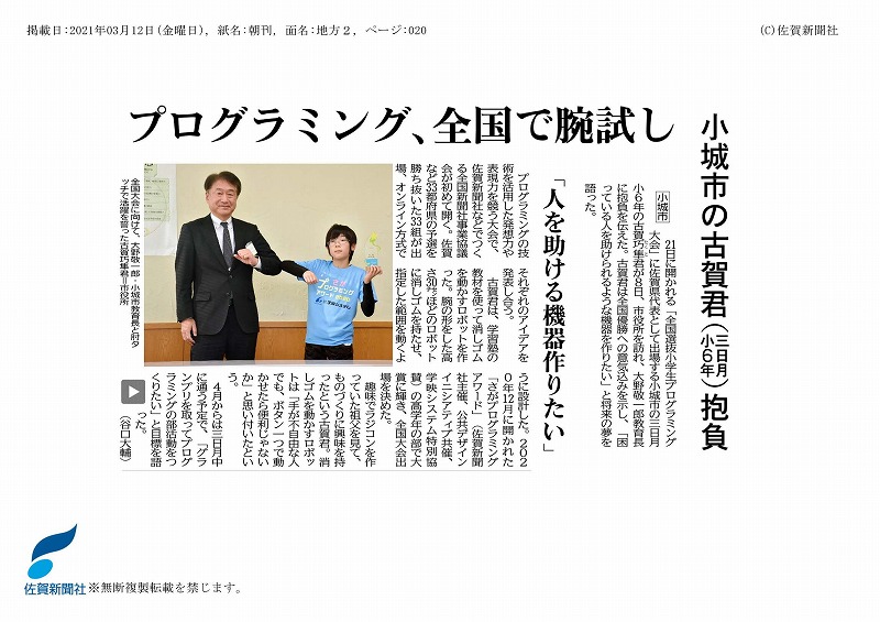 2020年12月に開かれた「さがプログラミングアワード」の高学年の部で大賞に輝いた小城市の三日月小学校6年生の古賀 巧隼君が21日に開かれる「全国選抜小学生プログミラング大会」に佐賀県代表として出場されます。