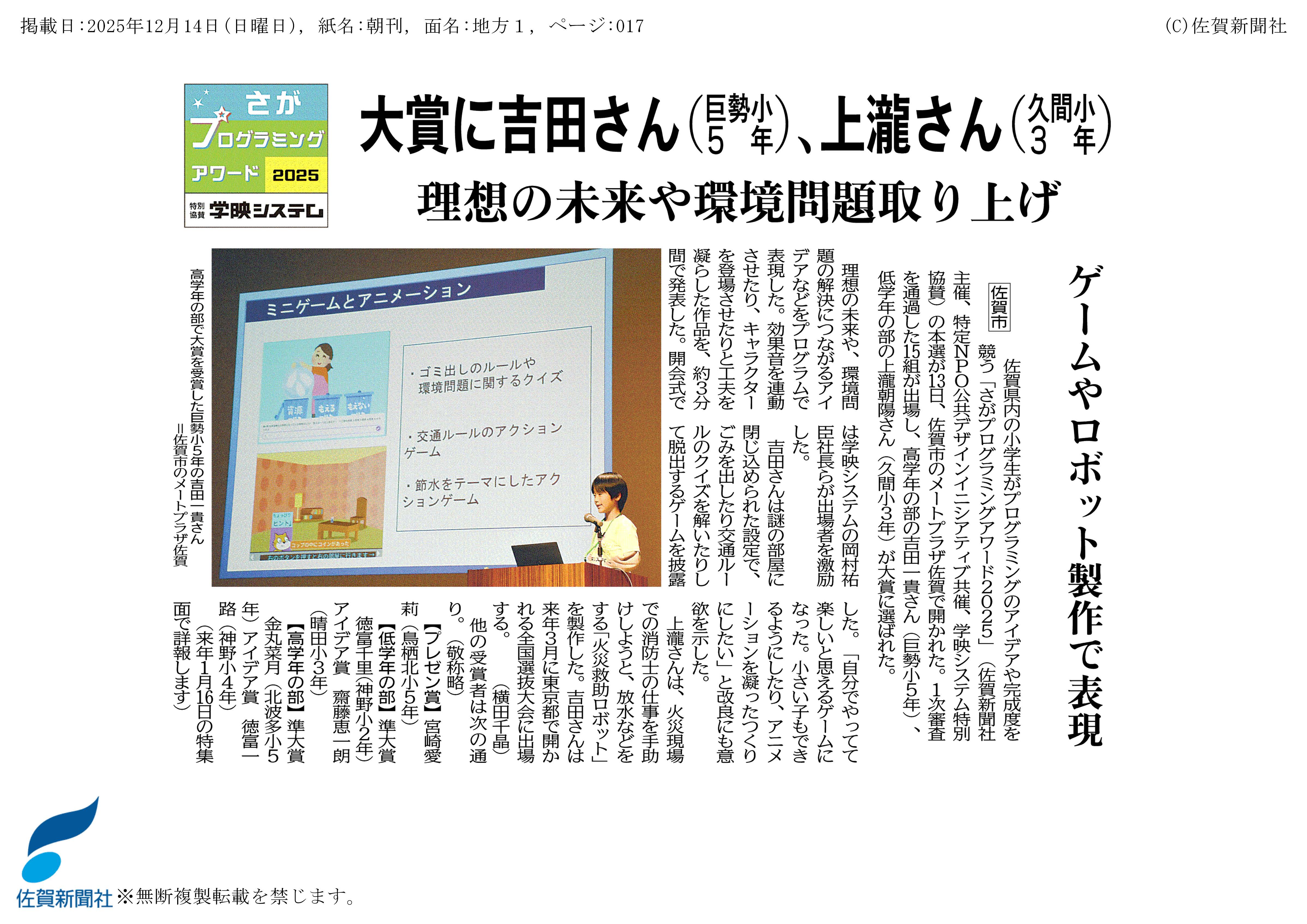弊社が特別協賛を行う「さがプログラミングアワード2025」が12月13日に開催され、